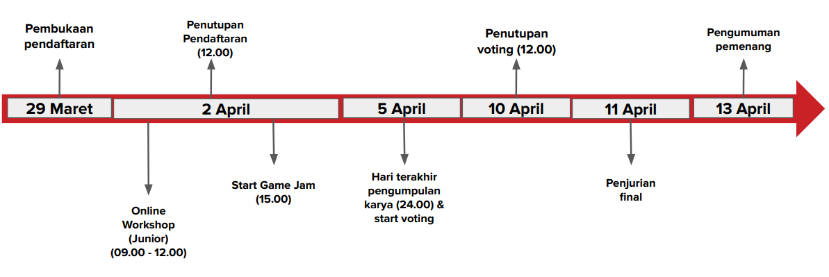 - Peserta dapat menggunakan tools, engine, library, script, atau assets apapun untuk membuat game.