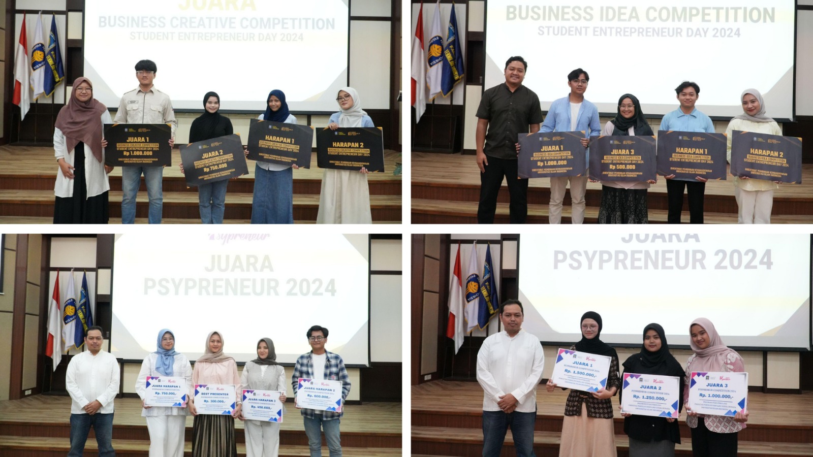 Terakhir, sesi yang banyak dinantikan oleh peserta yaitu pengumuman juara Student Entrepreneur Day dan Psypreneur 2024. Pada lomba Student Entrepreneur Day 2024, terdapat dua kategori yaitu Business Idea Competition yang mana Juara 1 dari kelompok “Mountlet”, Juara 2 “Sacafa”, Juara 3 “Dolanan”, Juara Harapan 1 “Skill Wave”, dan Juara Harapan 2 “Heartbites”. Selanjutnya, pada Business Creative Competition yang menjadi Juara 1 dari kelompok “Geber”, Juara 2 “Sister on Earth”, Juara 3 “Momsq Laundry”, Juara Harapan 1 “Hope”, dan Juara Harapan 2 “Dopamine”. Kemudian, pada lomba Psypreneur 2024 terdapat Juara 1 dari kelompok “Batik Sawastra” , Juara 2 “GenZehat”, Juara 3 “HealMind Trip”, Juara Harapan 1 “Bottle Buddy”, Juara Harapan 2 “Aksara Wicara”, Juara Harapan 3 “Serenity Difuser”, dan Best Presentation “Lilin Lumenera”.