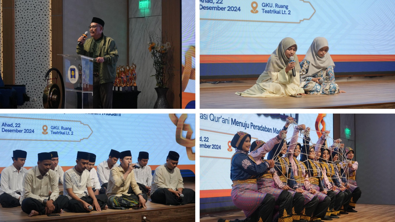 Kegiatan tersebut disemarakkan dengan antusiasme peserta selama mengikuti perlombaan Festival Qur`an UII 2024 dari sesi Opening yang dibuka oleh Bapak Faisal Arif Nurgesang, S.T., M.Sc. selaku Kepala Divisi Pembinaan Prestasi Direktorat Pembinaan Kemahasiswaan (DPK) UII yang dilaksanakan pada pagi hari. Dilanjutkan sesi Closing Ceremony pada malam hari yang ditutup secara langsung oleh Dr. Drs. Rohidin, S.H., M.Ag. selaku Wakil Rektor 3 bidang Kemahasiswaan, Keagamaan dan Alumni dengan rangkaian kegiatan rewarding para juara setiap bidang lomba dan penampilan Haflah Tilawatil Qur`an dari para Qori dan Qori`ah serta penampilan Tari Ratoh Jaroe dari Tim Xaviera Universitas Islam Indonesia.