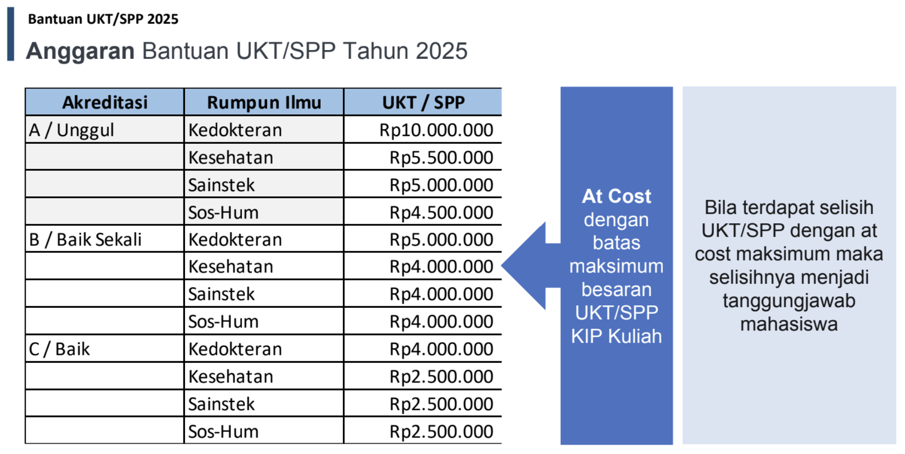 - Bila terdapat selisih UKT/SPP dengan at-cost maksimum maka selisihnya menjadi tanggungjawab mahasiswa.