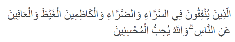 “(yaitu) orang-orang yang menafkahkan (hartanya), baik di waktu lapang maupun sempit, dan orang-orang yang menahan amarahnya dan memaafkan (kesalahan) orang. Allah menyukai orang-orang yang berbuat kebajikan.” (QS. Ali ‘Imran:134)