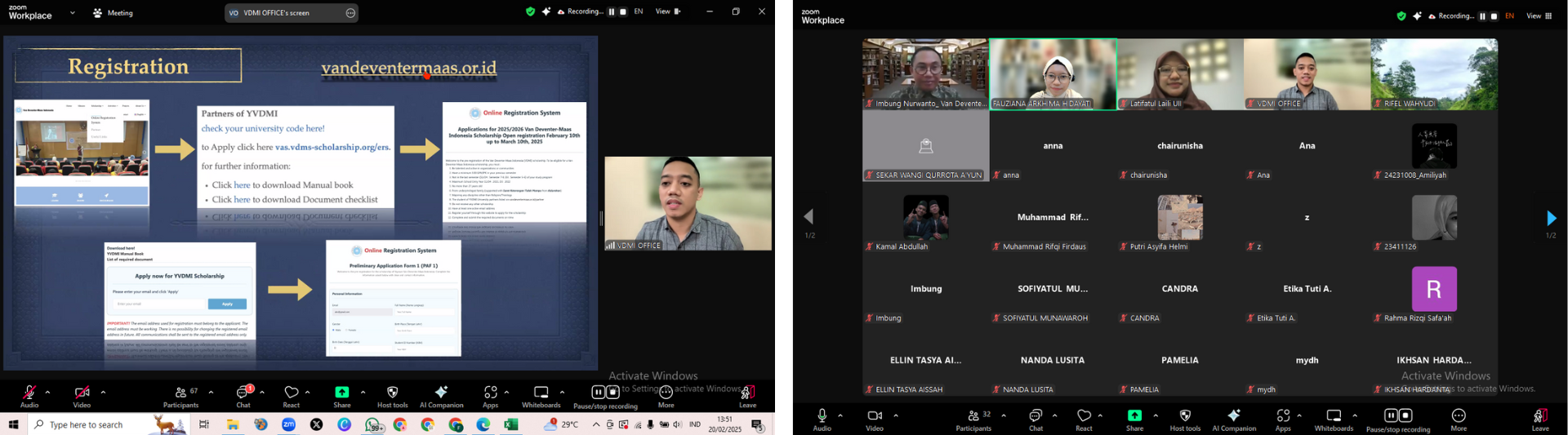 Pada Hari Kamis, 20 Februari 2025, Direktorat Pembinaan Kemahasiswaan (DPK) Universitas Islam Indonesia telah menyelenggarakan kegiatan Sosialisasi Beasiswa Van Deventer-Maas Indonesia (VDMI) melalui zoom meeting. Kegiatan ini bertujuan untuk memberikan akses informasi, menjangkau mahasiswa berpotensi, dan mendukung kemandirian melalui bantuan finansial dan pengembangan diri mahasiswa. Beasiswa VDMI sendiri merupakan beasiswa yang diberikan oleh Yayasan Van Deventer-Maas Indonesia (YVDMI) kepada mahasiswa yang berasal dari keluarga dengan keterbatasan finansial. Kegiatan sosialisasi dihadiri oleh lebih dari 50 mahasiwa Universitas Islam Indonesia yang berasal dari berbagai fakultas dan program studi.