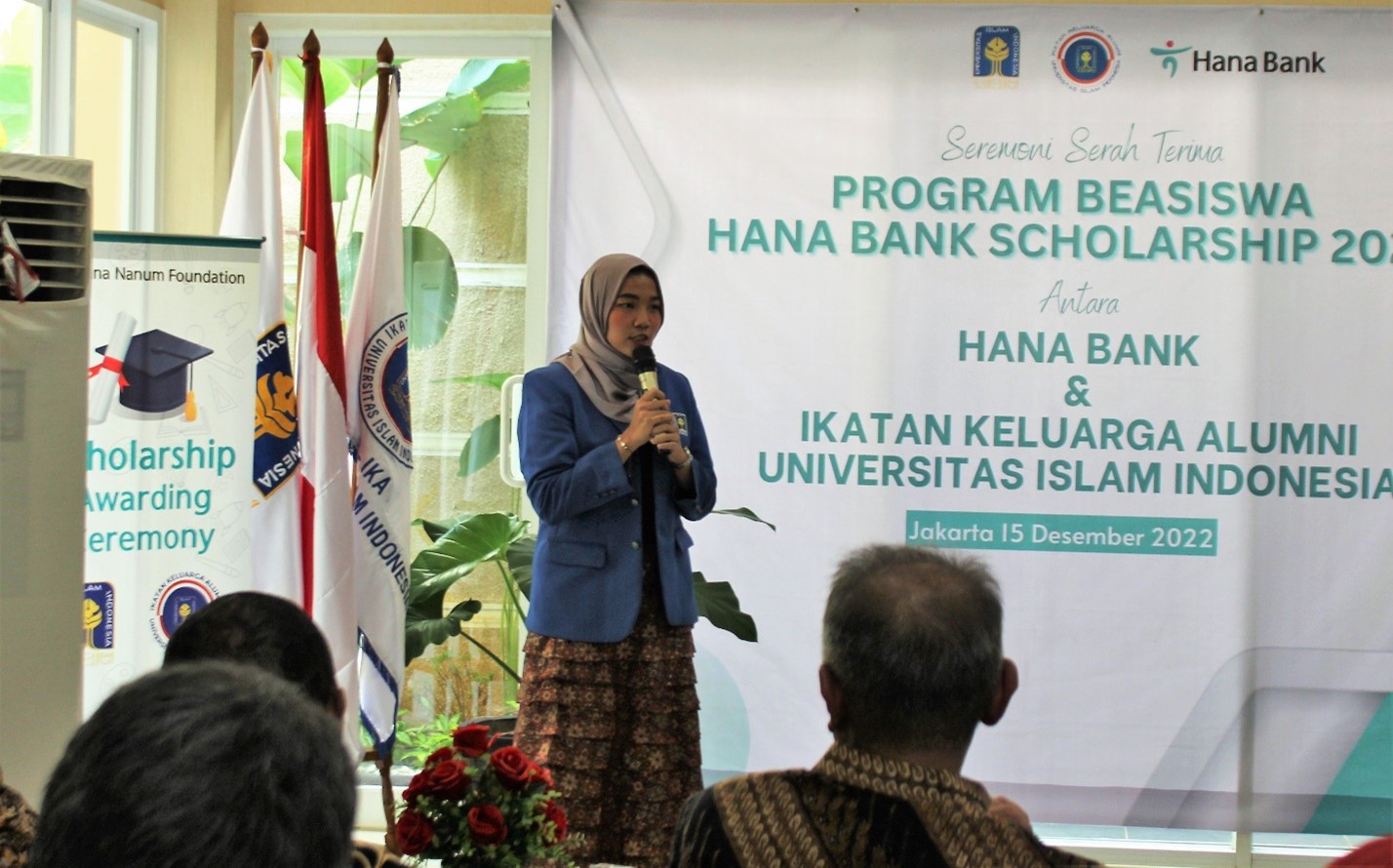 Kegiatan seremoni serah terima ini juga dihadiri oleh perwakilan mahasiswa penerima Hana Bank Scholarship 2022, Syadza Hulwah Adlin (Hubungan Internasional 2019), untuk menyampaikan ucapan terima kasih melalui pidatonya.