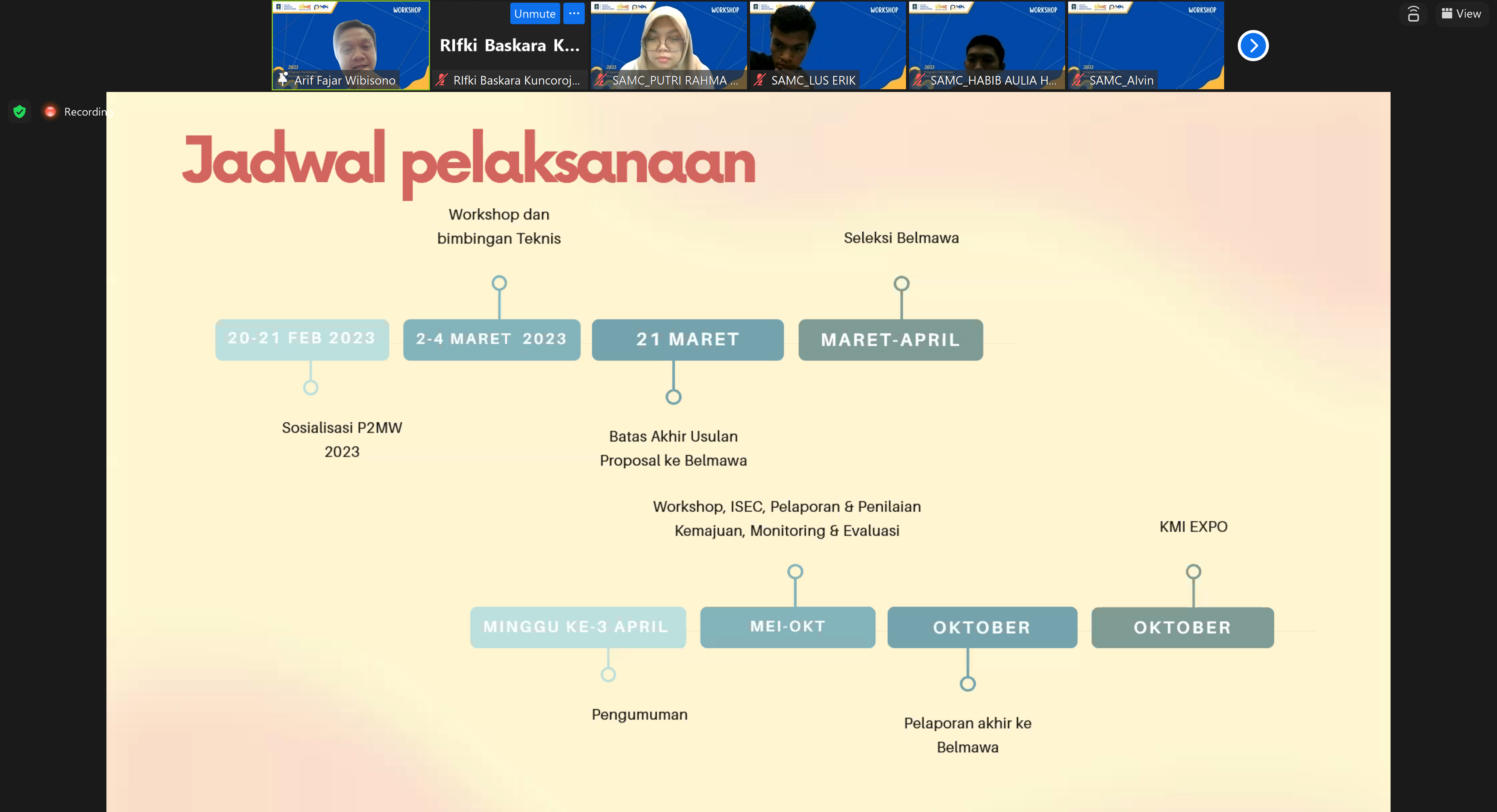 Pada hari Sabtu, 4 Maret 2023 DPK UII dan SAMC UII telah menyelenggarakan Workshop P2MW untuk memberikan penjelasan dan panduan umum mengenai kegiatan ini. Workshop diadakan secara daring melalui Zoom Meeting. Sekitar 50 mahasiswa telah bergabung dan menghadiri acara workshop yang dimulai pukul 09.00 hingga 11.30 WIB. Acara Workshop P2MW ini diisi oleh Arif Fajar Wibisono, S.E., M.Sc. (Kepala Divisi Pembinaan Prestasi DPK UII), Rininta Hanum, ST., M.Eng., CBC. (Wakil Direktur IBISMA UII), dan Roaida Yanti (Juara Harapan 2 KMI Award, CEO Juwana Fishcips).
